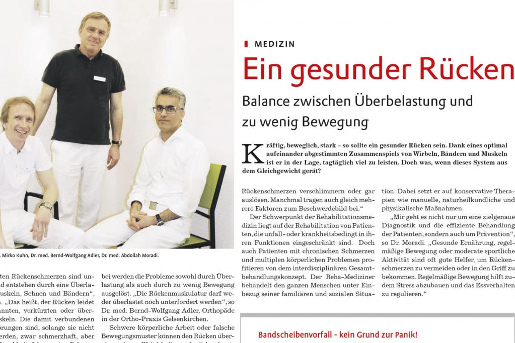In der Juni-Ausgabe 2014 der Knappschafts-Zeitung "Neues von Prosper" gibt die Praxis Adler / Kuhn / Moradi wertvolle Tipps für einen gesunden Rücken. Was ist zu tun bei Rückenschmerzen? Welche Ursachen gibt es? Was kann man tun? Wie kann man vorbeugen? Antworten auf diese und andere Fragen liefern die drei Wirbelsäulen-Experten im folgenden Beitrag